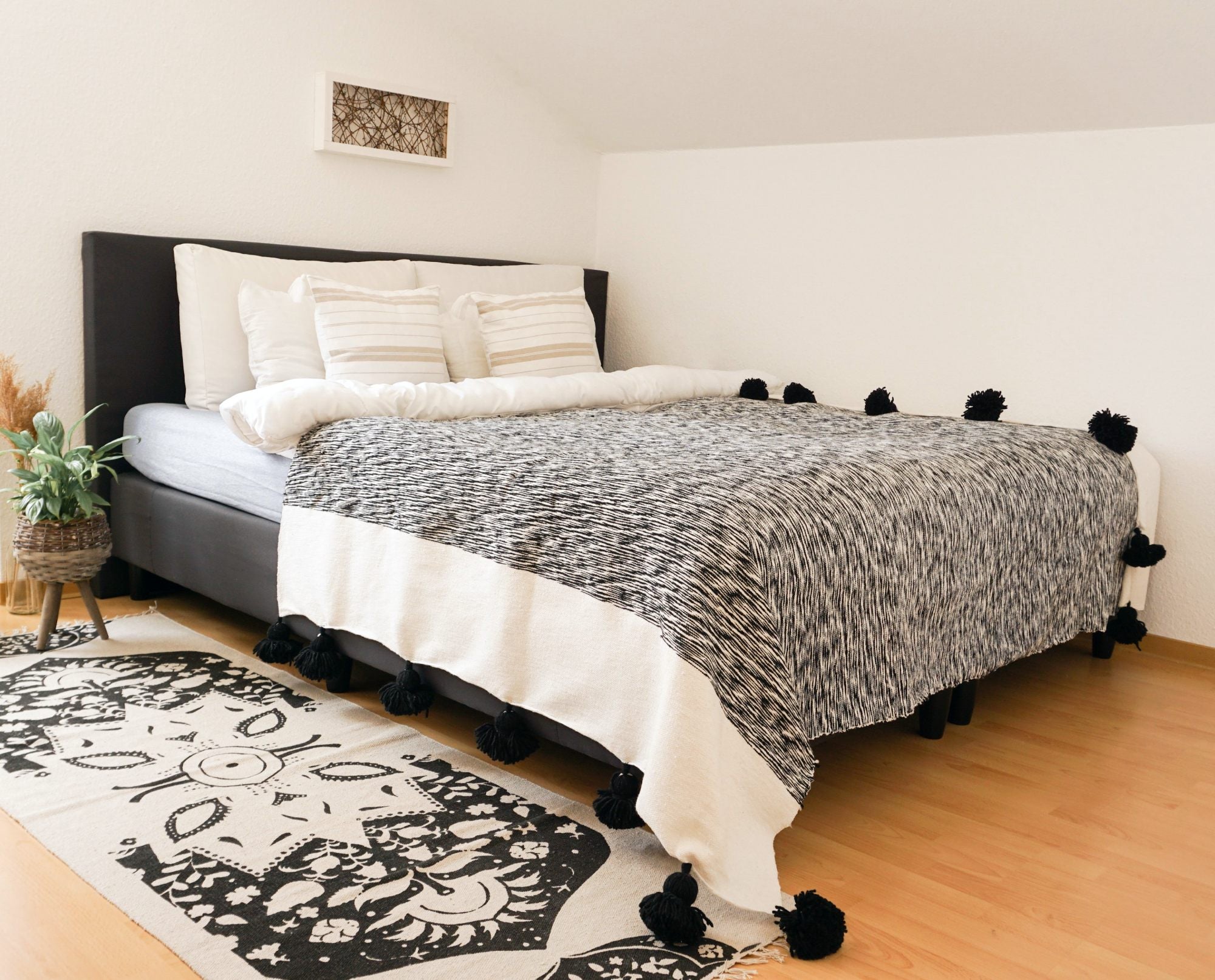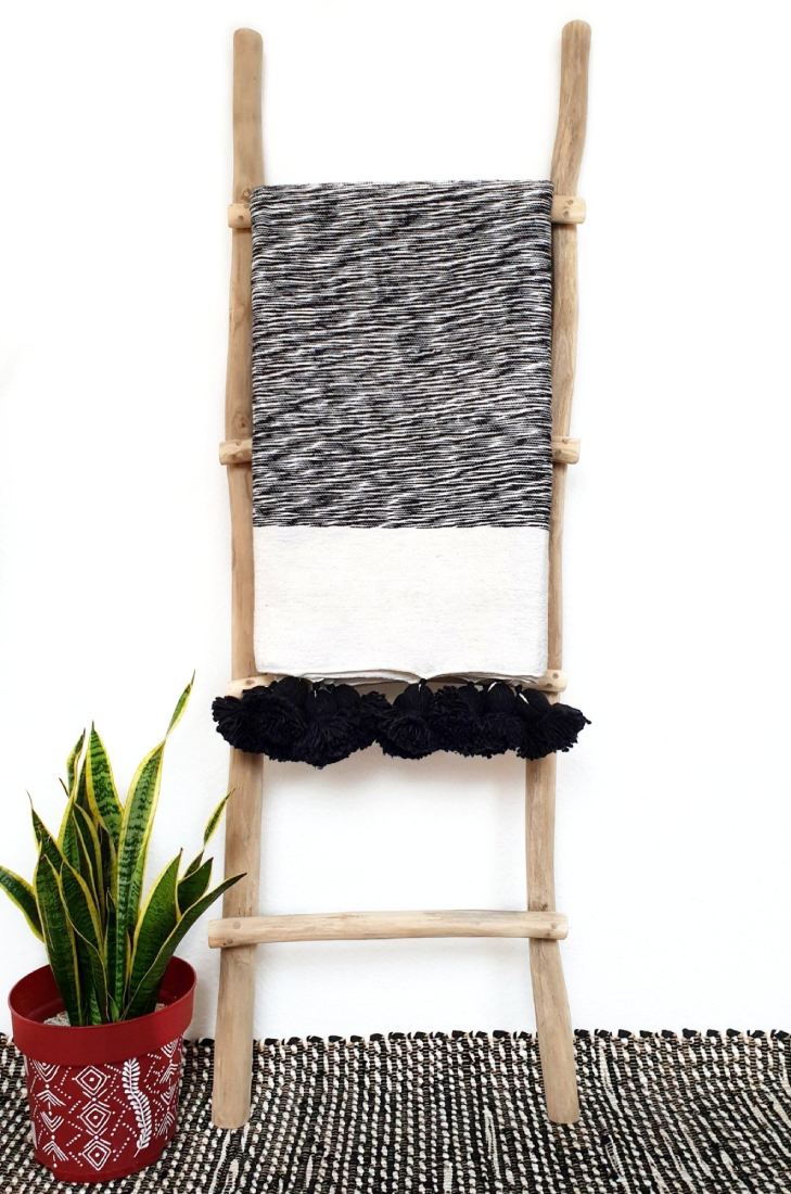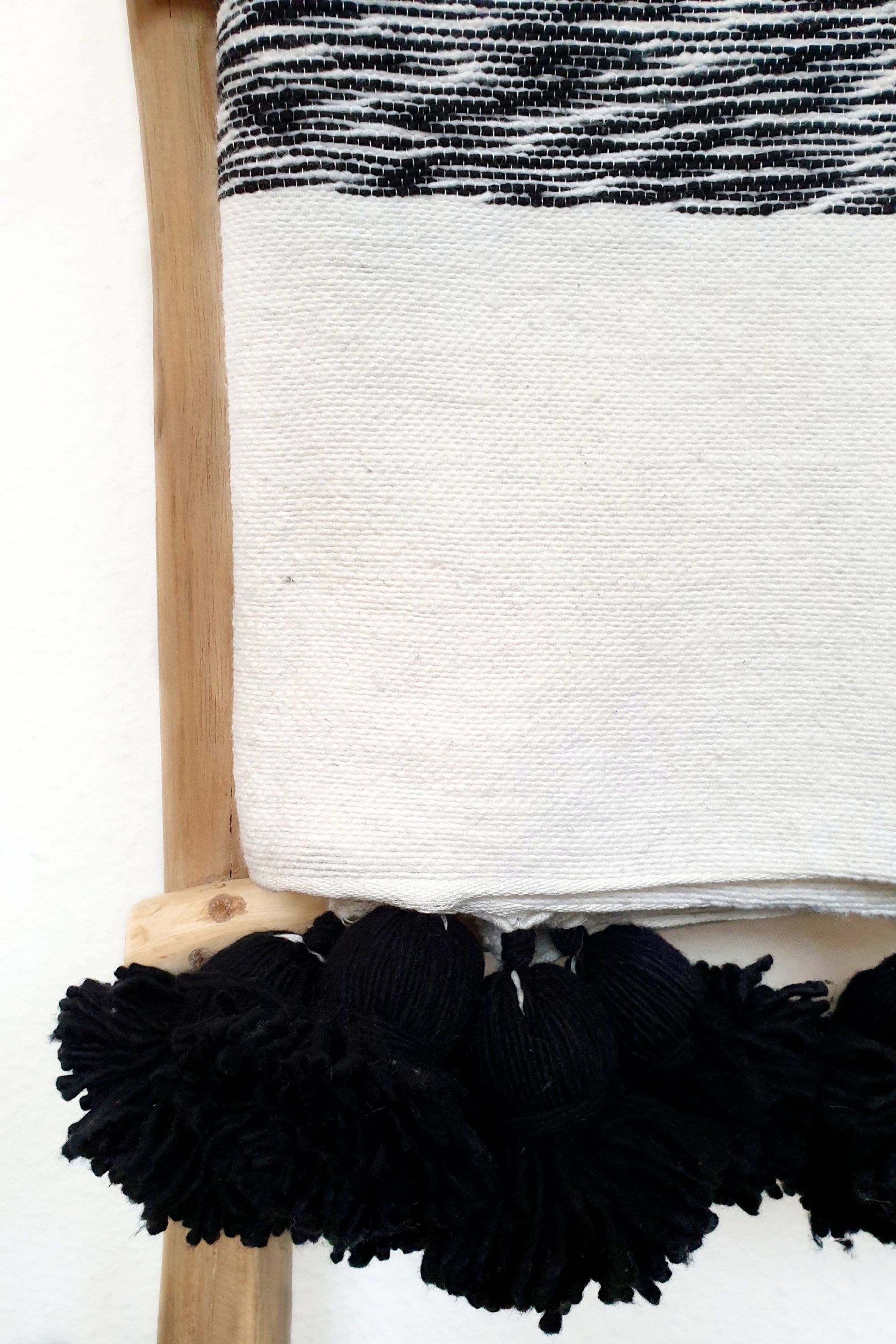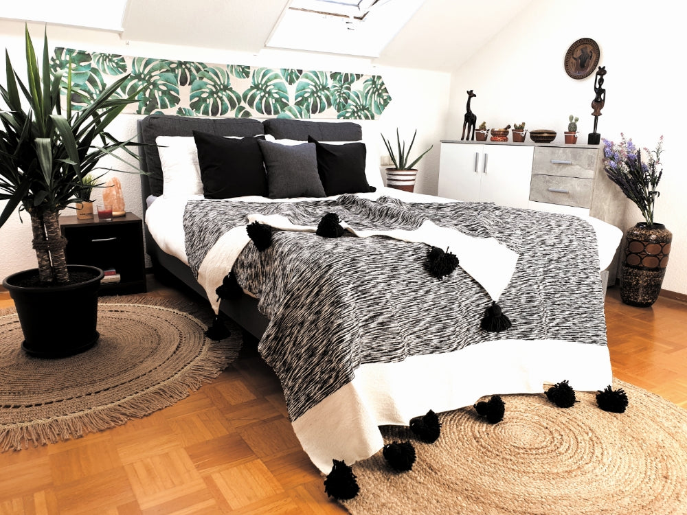 Our pom pom blankets are made by skilled Berber artisans from the Atlas Mountains of Morocco. Handwoven on wooden looms from 100% cotton using a traditional technique, the blankets are thicker and warmer than most blankets, making them an ideal comforter. Plus, they can also be used on the couch, as a rug, as a beach or picnic blanket (our personal favourite), or even as a comfy playmat for the kids!